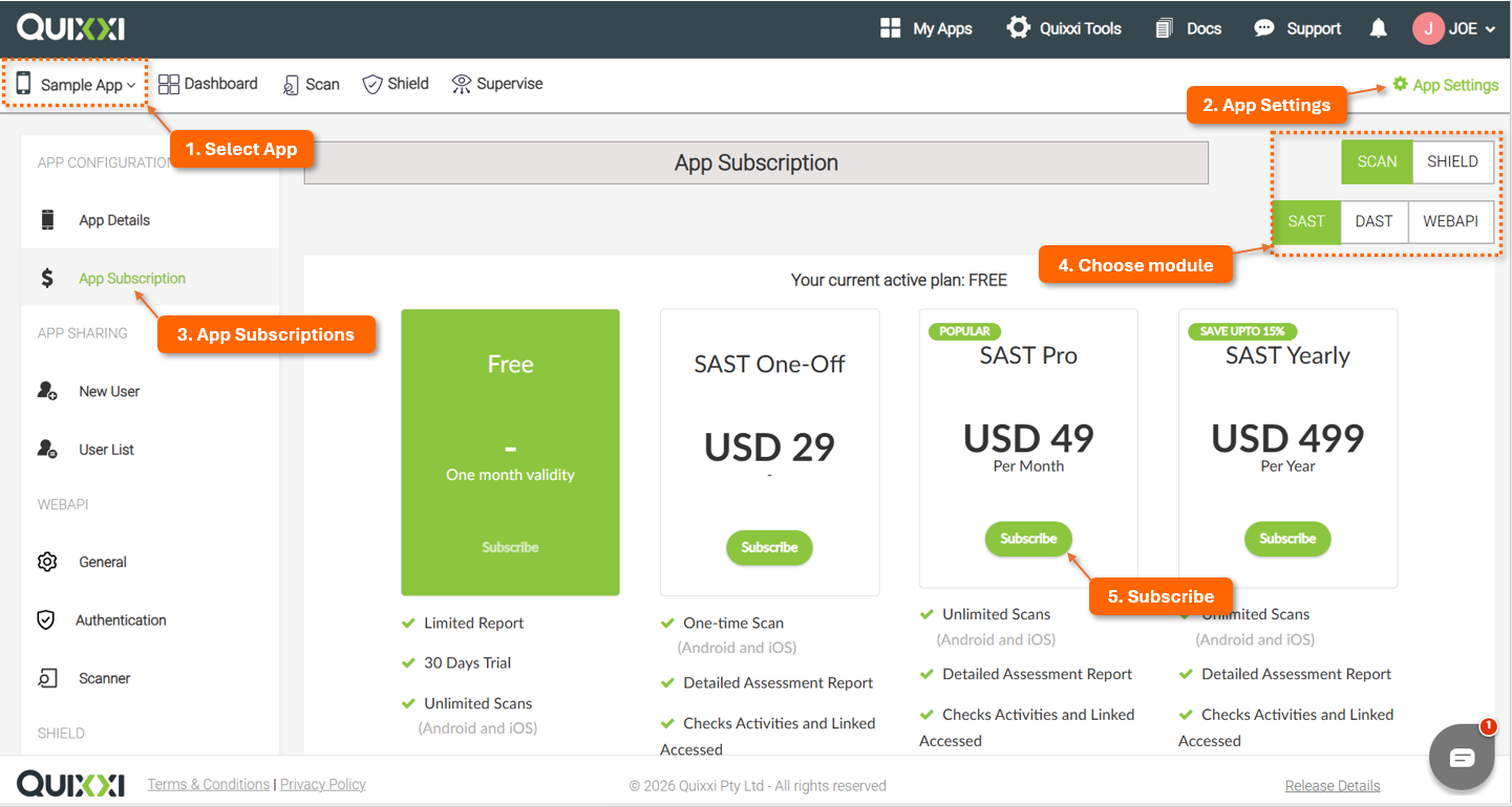Select App > Settings > App Subscription > Choose Modules (Shield, SAST, DAST, API scan)> Subscribe Plan