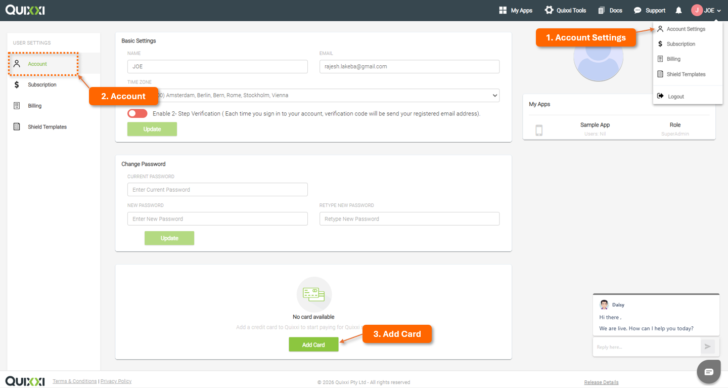 Add your payment card. If a card is already added, your account will be charged and you can start using the services immediately.