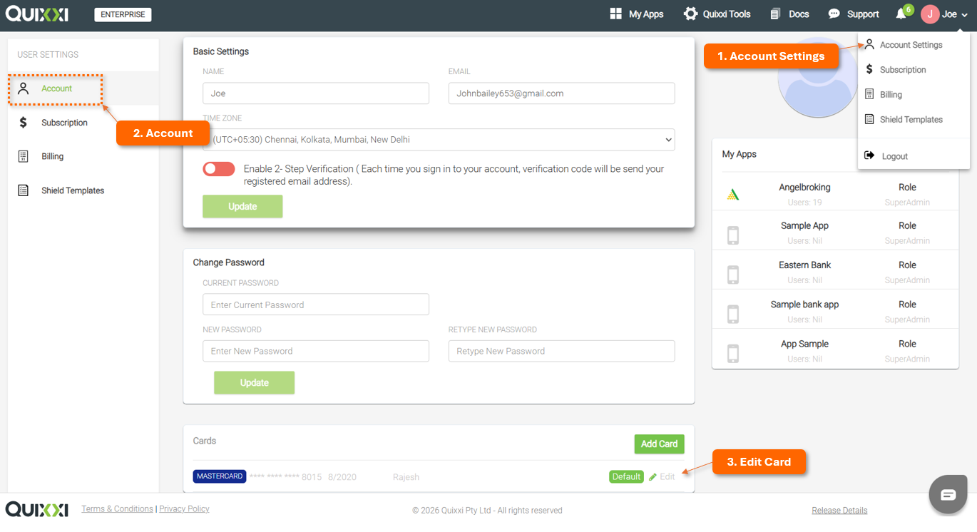 1. Account Settings -> 2. Account -> 3. Edit or Add Card