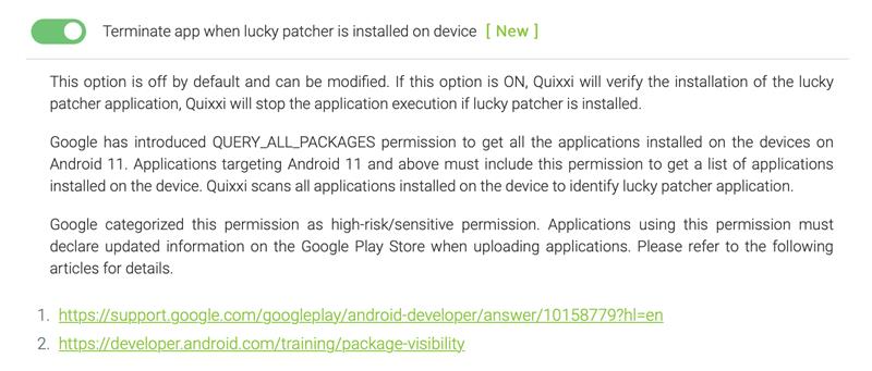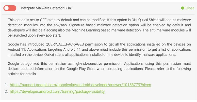 You can control whether this permission is added. If you disable both Malware Detection and Lucky Patcher Detection in the Shield Options, Quixxi will not include the QUERY_ALL_PACKAGES permission in your app.
